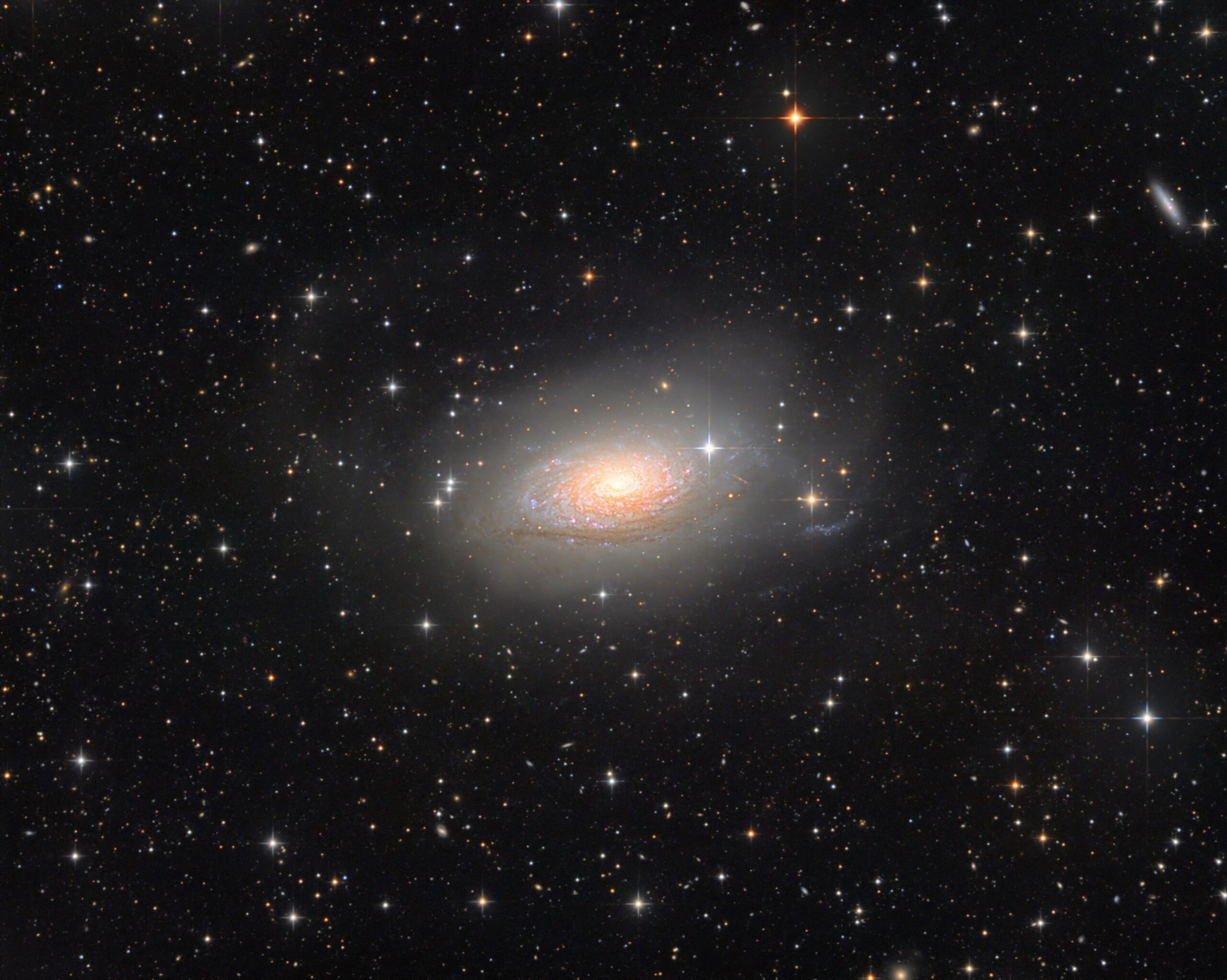 M63 Sunflower in Canes Venatici M 63 in Canes Venatici, ASAN10 Trius 694 L 908min, ASK8 Trius 694 RGB a‘ 275min Ha 425min,Gahberg 20200405 - 0424 Messier 63 (auch als NGC 5055 bezeichnet) ist eine Spiralgalaxie mit den Abmessungen 12,6′ × 7,2′ und der scheinbaren Helligkeit von 8,5 mag im Sternbild Jagdhunde. Das auch Sonnenblumen-Galaxie genannte Objekt ist vom Sonnensystem etwa 25 Millionen (je nach Quelle auch 30 oder 37 Mio.) Lichtjahre entfernt und besitzt einen Durchmesser von 50.000 (65.000) Lichtjahren. Ungewöhnlich und namensgebend sind die vielen, in der Spitzer-Aufnahme besonders gut sichtbaren, knötchenartigen Verdichtungen in ihren Spiralarmen, es handelt sich dabei um Sternentstehungsgebiete und leuchtende Gaswolken. In sehr langbelichteten Aufnahmen wird ein Sternstrom in Form eines 14 Bogenminuten herausreichenden, nur 1,6 Bogenminuten breiten Bogens sichtbar. Eine detaillierte Studie von Taylor S. Chonis u. a. kommt zu dem Schluss, dass hier eine Zwerggalaxie mit rund 100 Millionen Sonnenmassen verschluckt wurde. Dabei erzeugte die Gezeitenwechselwirkung beim Zerreißen auch den heute noch sichtbaren, weiten Sternenstrom. Interessant ist auch die sich über rund 1000 Lichtjahre erstreckende sehr helle Zentralregion von M 63. Sie umgibt einen aktiven Kern und übertrifft ihre Umgebungshelligkeit um das Sechsfache, im H-alpha-Licht sogar um das 25-Fache. Die hier gemessenen Rotationsgeschwindigkeiten lassen auf ein zentrales Schwarzes Loch von knapp einer Milliarde Sonnenmassen schließen. Das Objekt wurde am 14. Juni 1779 von Pierre Méchain entdeckt