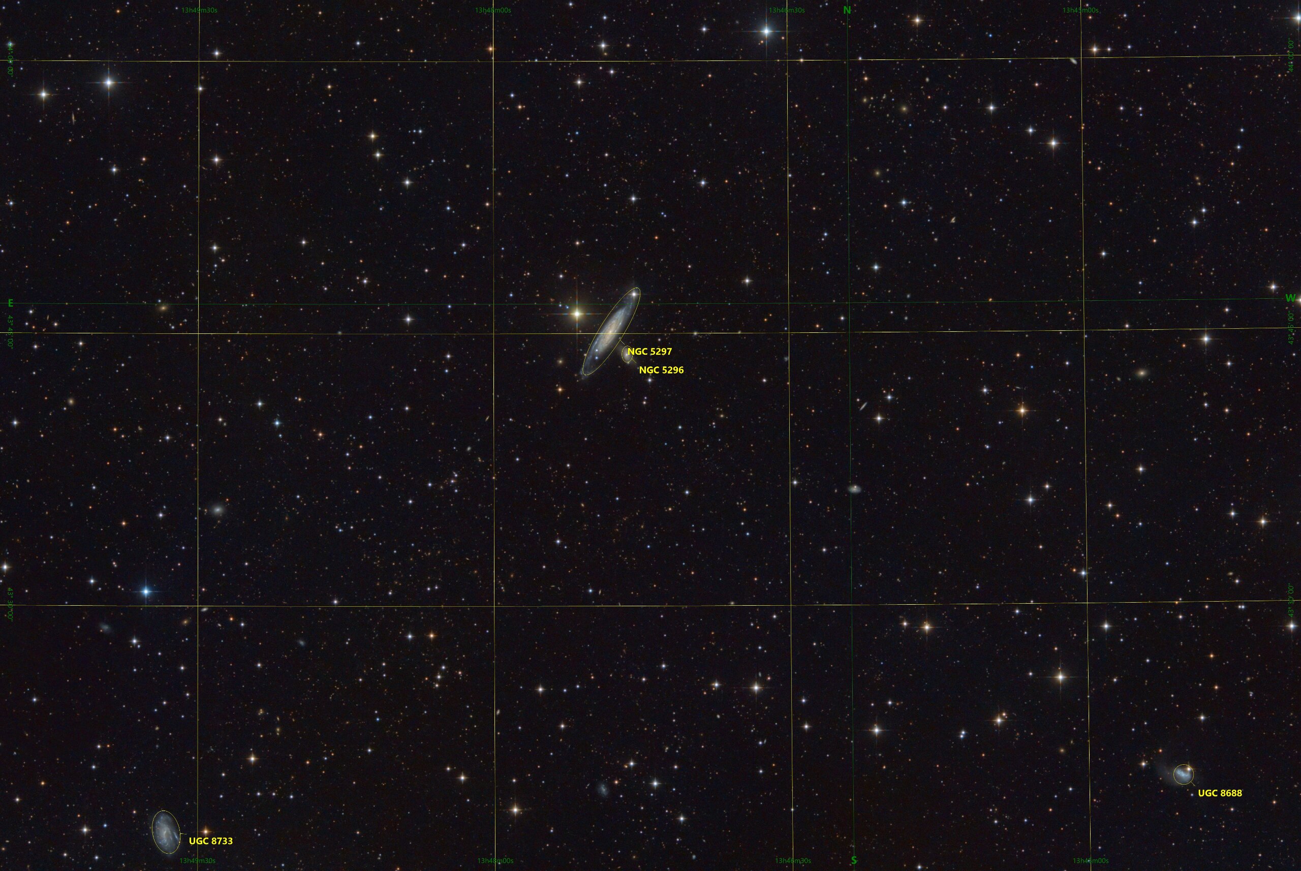 NGC 5297/5296 in Canes Venatici, ASA N10 DSPro 2600m L35x500s, ASK8/f3 Nexus DSPro 2600C, 52x300s total 9,2h, Crop, ASA DDM85, Gahberg 20240308