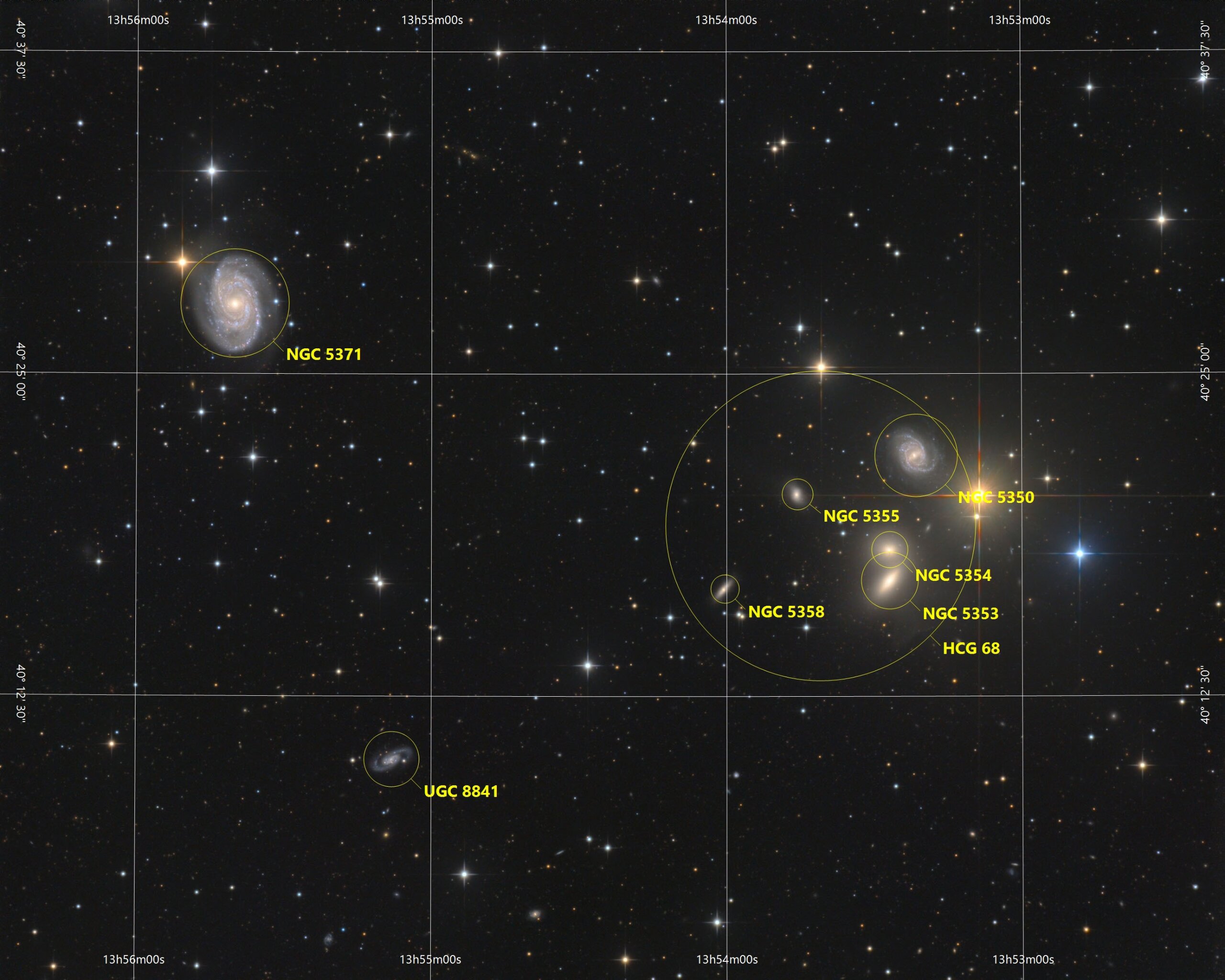 NGC5371, 5353 HCG68-Grid NGC 5371, NGC5353 Group in Canes Venatici, ASAN10 Trius 694 L717min, ASK8 Trius 694 RGB a‘117min, Gahberg 20210404-0414