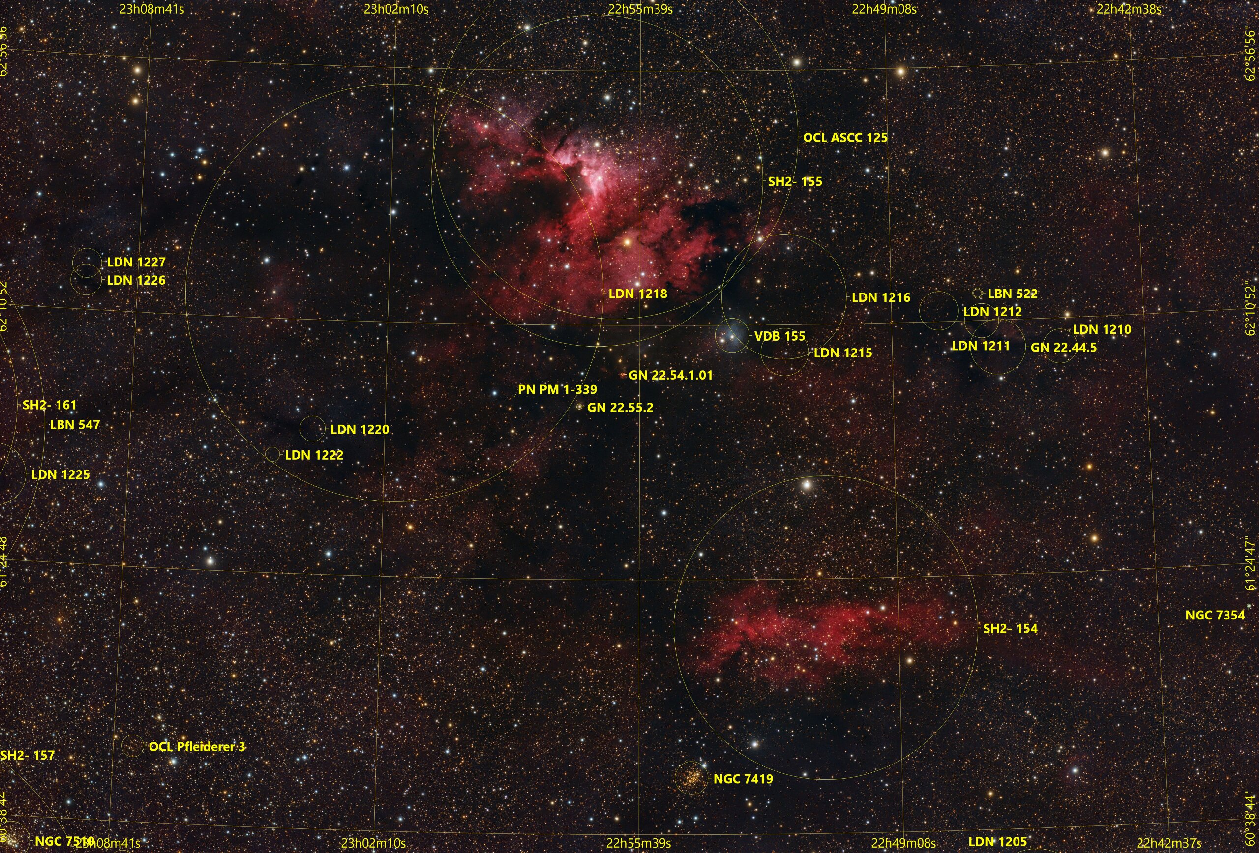 SH2-155, SH2-154 in Cepheus, Redcat71, IMX571C, Gain 0, Offset 100, 88x300s L-extreme 140x300s total19h, iEQ30Pro, Gahberg 20250920-1106