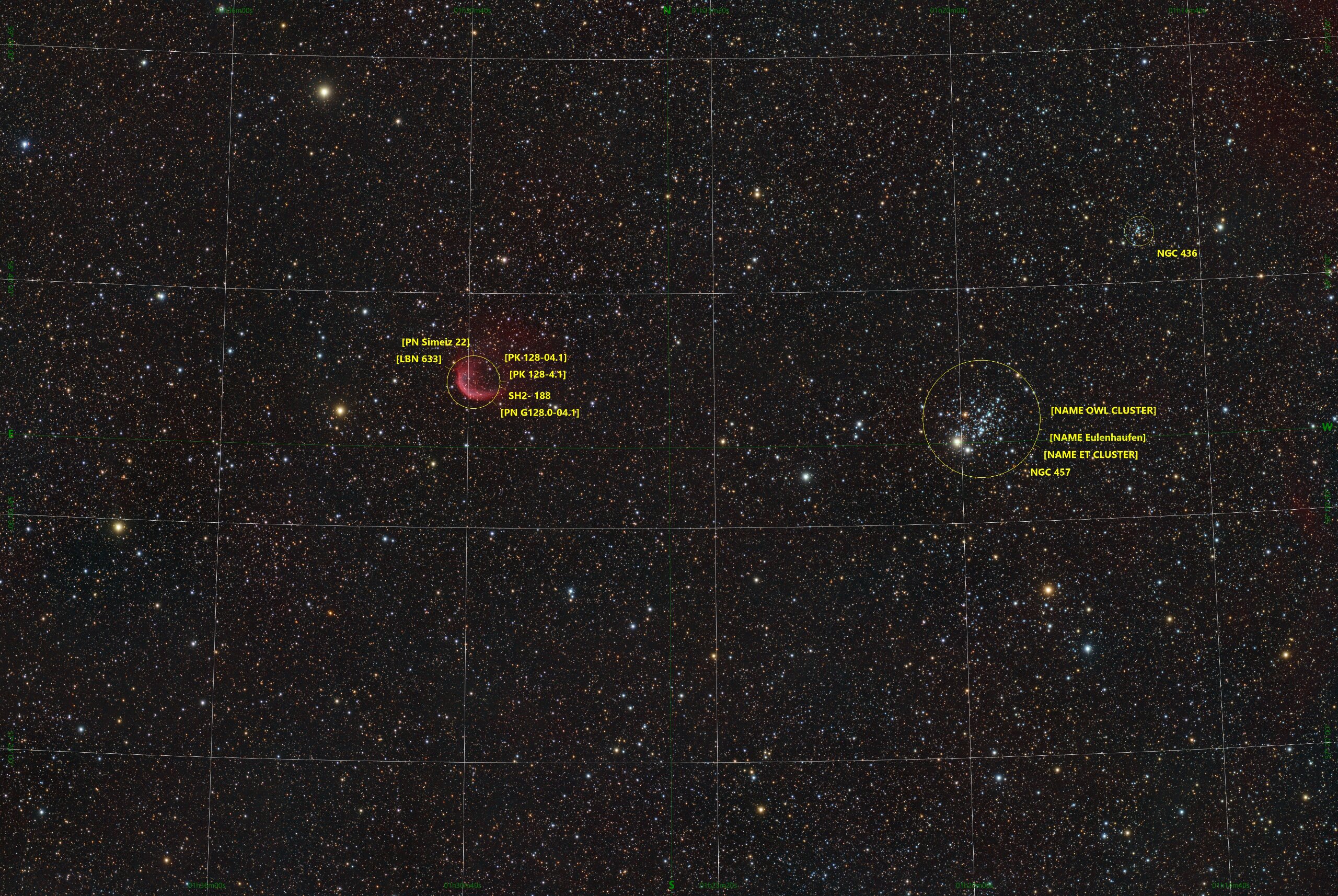 SH2-188, NGC457&436 in Cassiopeia, Redcat71, IMX571C, Gain 0, Offset 100, 37x300s L-extreme 53x300s total 7,5h, iEQ30, Gahberg 20241104