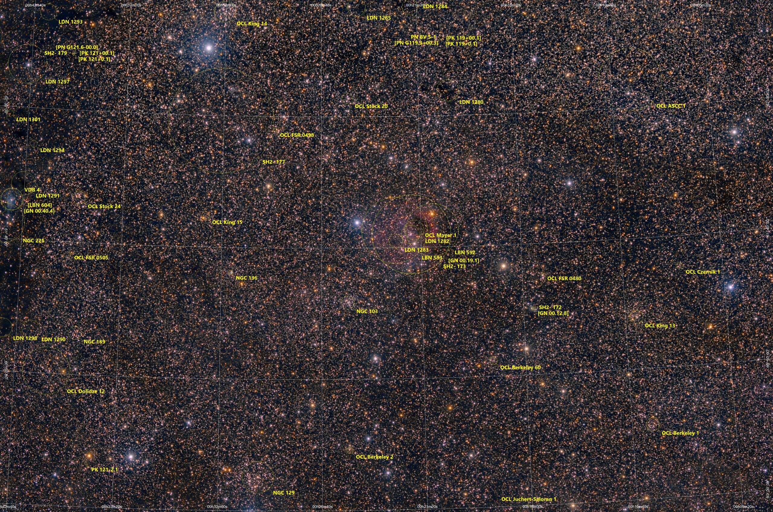 Sh2-173 and Clusters in Cassiopeia, Esprit 80-400, Canon EOS6D ISO 1600 76 x 480s 608min Gahberg 20190923 - 1026