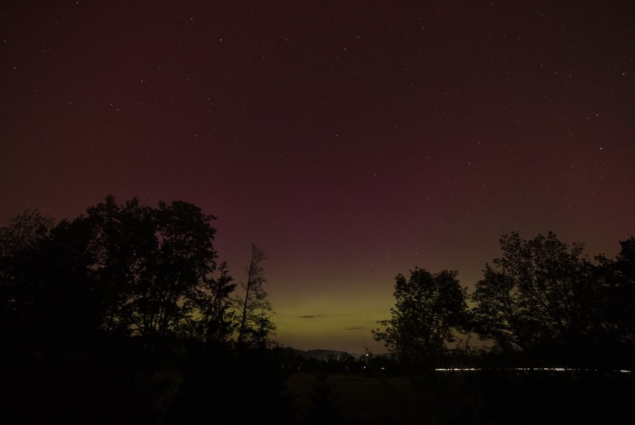 Polarlicht Timelaps Von Mitternacht bis zur Dämmerung. Die Lichtspuren rechts unten kommen von der Fahrzeugen die von und nach Bad Schallerbach unterwes sind. Das Polarlicht war so hell das sogar die Lichtverschmutzung von Pichl, Bad Schallerbach, Schlüsselberg usw. überstrahlt wurde. An Himmelsbeobachtung oder Fotografie ist in diesem künstlichen Lichtsumpf nicht zu denken.
