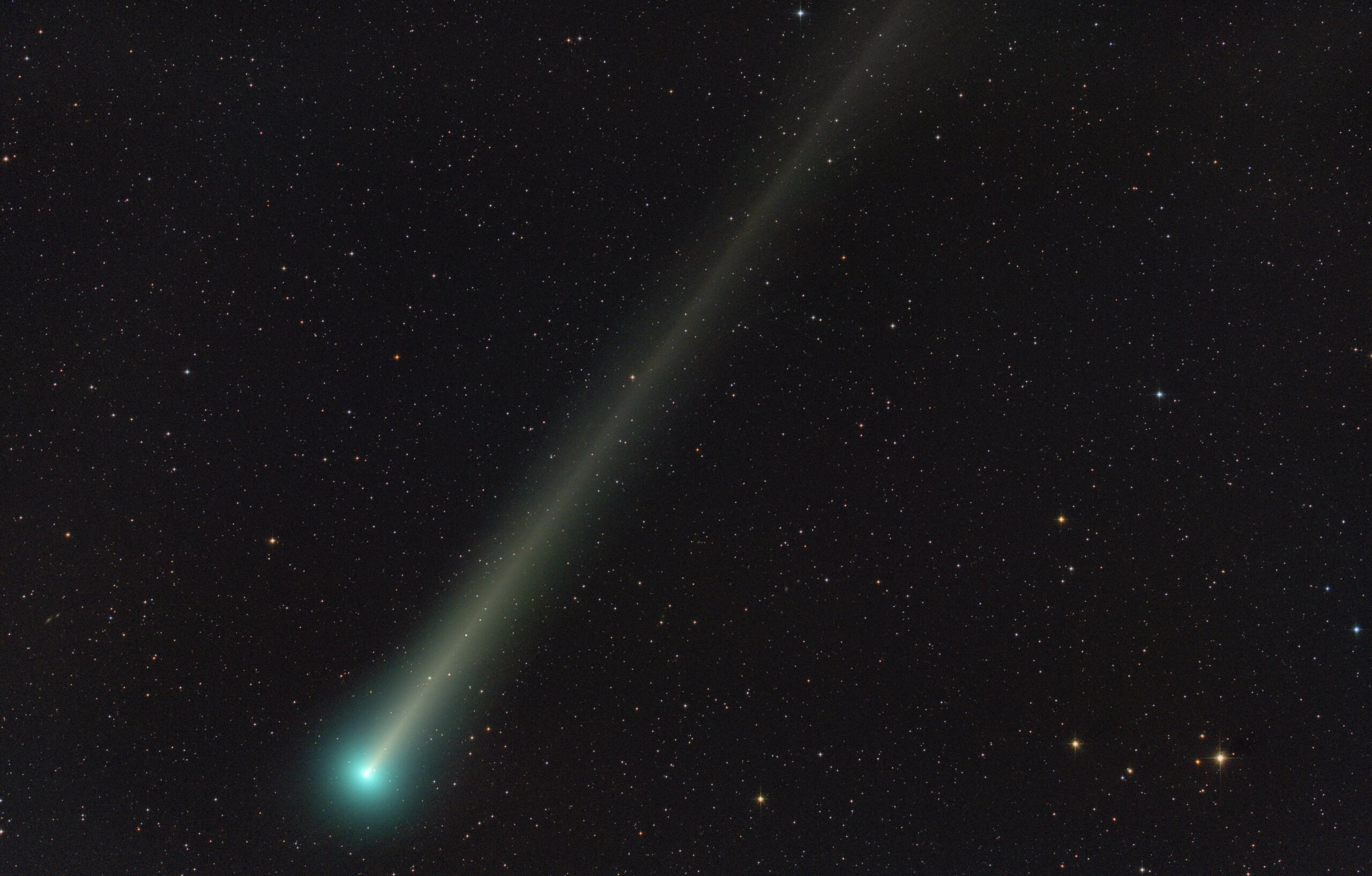 C/2021 A1 (Leonard) Canon EOS6Da Takahashi Epsilon 130D ISO1600 33 x 60s h ASA DDM85 Gahberg 20211208 UTC 04:25 - 06:01 C/2021 A1 (Leonard) ist ein retrograder, langperiodischer Komet[1], der am 3. Januar 2021 (auf den Tag genau ein Jahr vor seiner berechneten größten Annäherung an die Sonne) von Gregory J. Leonard am Mount Lemmon-Observatorium bei Tucson im US-Bundesstaat Arizona entdeckt wurde. Zu diesem Zeitpunkt war C/2021 A1 etwa 5 AU von der Sonne entfernt, ungefähr so weit wie die Jupiter-Umlaufbahn.[2] Er ist der erste im Jahr 2021 entdeckte Komet. Am 12. Dezember 2021 wird er sich bis auf 0,23 AU (ca. 34,4 Millionen km) an die Erde annähern, am 18. Dezember 2021 bis auf 0,028 AU (ca. 4,2 Millionen km) an die Venus.[3 Am 3. Januar 2022 wird er das Perihel erreichen, etwa 0,62 AU von der Sonne entfernt. Am 10. Oktober konnte an dem Kometen ein kurzer, aber dichter Staubschweif beobachtet werden.[4] Es wird erwartet, dass C/2021 A1 im Laufe des Dezembers 2021 eine scheinbare Helligkeit von 4 mag erreicht. Dann wäre er mit bloßem Auge am Nachthimmel zu erkennen und könnte schon mit einem Fernglas gut beobachtet werden.[5] Am Morgen des 6. Dezember 2021 wird C/2021 A1 etwa 5° von Arktur entfernt am Himmel stehen. Gegen 14. Dezember 2021 steht er dann 14,7° entfernt von der Sonne[6] und wird danach von der Südhalbkugel aus immer besser zu beobachten sein. Durch Streuungseffekte könnte der Komet dann eine Helligkeit von bis zu 1 mag erreichen.[7] Auf seiner Bahn um die Sonne ist der Kometenkern bereits Mitte 2009 in die Umlaufbahn des Neptun eingetreten, allerdings in sehr steilem Winkel von oberhalb der Bahnebene der Planeten.[8] Seine Umlaufzeit wird auf etwa 80.000 Jahre berechnet, die weiteste Entfernung zur Sonne auf rund 3.700 AU – 75 Mal so weit wie die Umlaufbahn des Pluto (Aphel 49,3 AU).[9] Es wird angenommen, dass C/2021 A1 nach Durchlaufen seines Perihels in eine hyperbolische Umlaufbahn einschwenkt und somit aus dem Sonnensystem geschleudert wird.[10] Quelle: Wikipedia