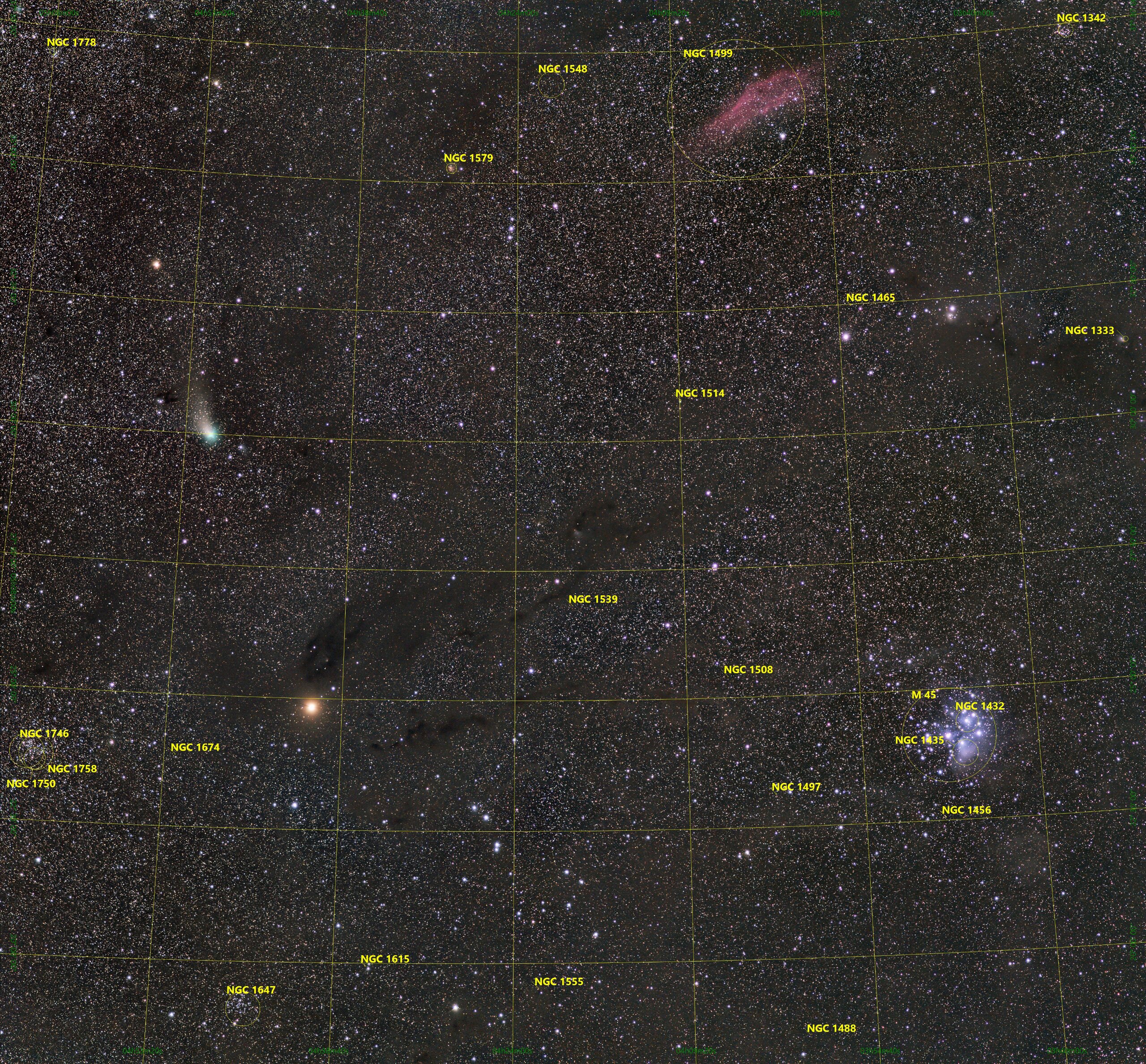 Komet C/2022 E3 (ZTF) auf dem Weg vom Sternbild Fuhrmann ( links oben ) Richtung Sternbild Stier (unten) aufgenommen am Abend des 09.02 2023 auf der Sternwarte Gahberg. Links ganz hell und rötlich der Mars, oben der Kalifonrnianebel und rechts die Plejaden, das Siebengestirn mit den blauen Reflexionsnebel. Diese Gegend in unserer Milchstrasse ist voll von „Staub“, sichtbar als Dunkelnebel (braunschwarze Strukturen die das Sternenlicht nicht durchscheinen lassen ) Eine Kombination die es nur einmal zu sehen gab. Der Kalifornianebel ist ca. 1000 Lichtjahre entfernte Wolke in unserer Galaxie aus leuchtendem Gas in der Sterne entstehen. Er ist mit bloßem Auge kaum wahrnehmbar eher mit einem lichtstarken Fernglas bei sehr dunklem Himmel. Die hellen Sterne der Plejaden sind markant und leicht zu erkennen. Um die blauen Reflexionsnebel sichtbar zu machen nutzt man wie bei den Wasserstoffwolken dass Kalifornianebel am besten die Fotografie. (Eine Kamera sammelt während der Belichtungszeit das Licht, unser Auge kann nur den Moment wahrnehmen.) Für die Aufnahme habe ich ein Canon EF100/2.0 Festbrennweite und eine EOSR benutzt welches auf dem Hauptinstrument montiert war. Belichtet wurde 38 x 100 Sekunden jeweils auf 2 Bildfelder die ich mit der Software Pixinsight zusammengesetzt habe. Der letzte „ Feinschliff“ erfolgte wie immer in Photoshop
