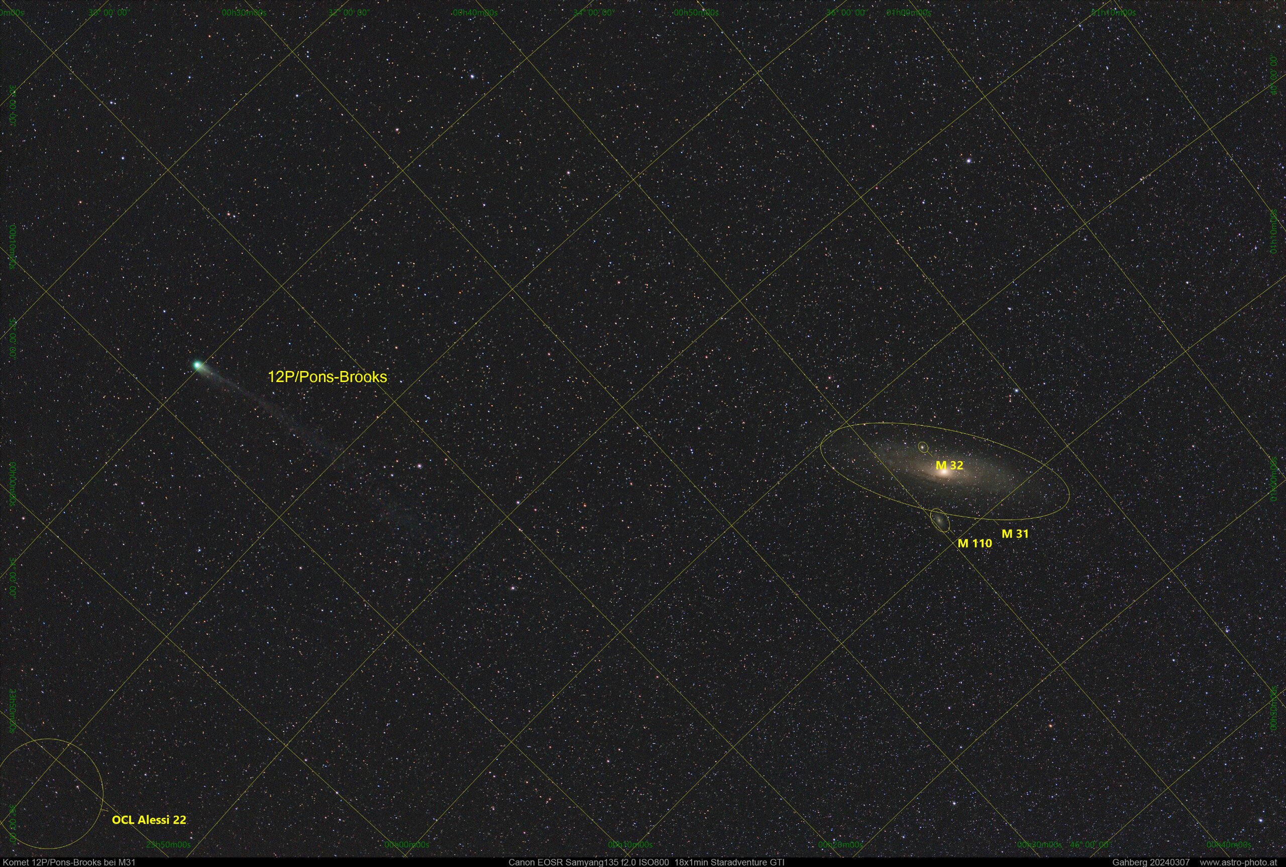 Komet 12P/Pons-Brooks bei M31, Canon EOSR Samyang135 f2.0 ISO800 18x1min Staradventure GTI, Gahberg 20240307