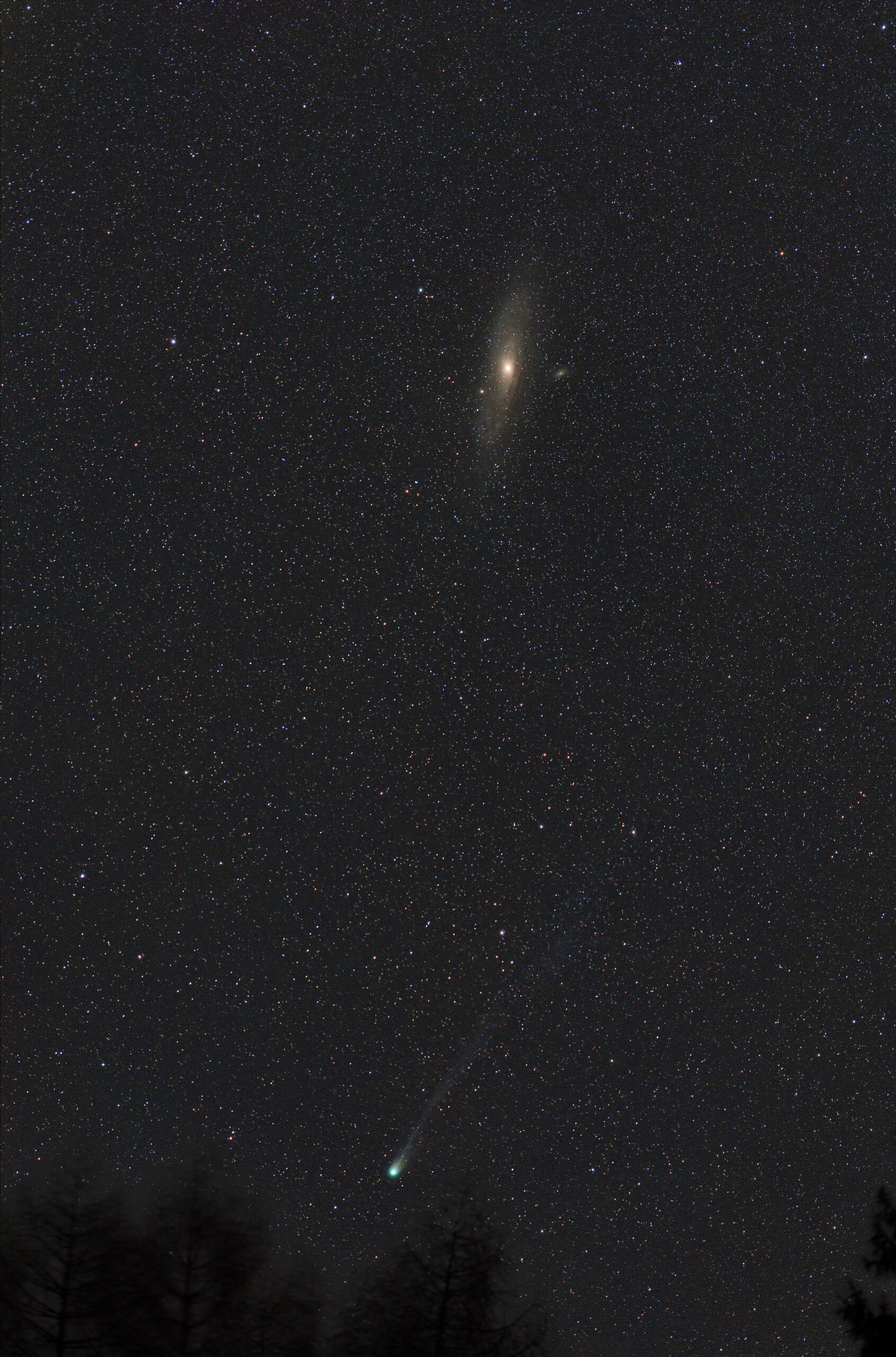 20240307-12P-Pons-Brooks-bei-M31-vorm-Wald Komet 12P/Pons-Brooks bei M31, Canon EOSR Samyang135 f2.0 ISO800 18x1min, composit with Landscape 10sec, Staradventure GTI, Gahberg 20240307