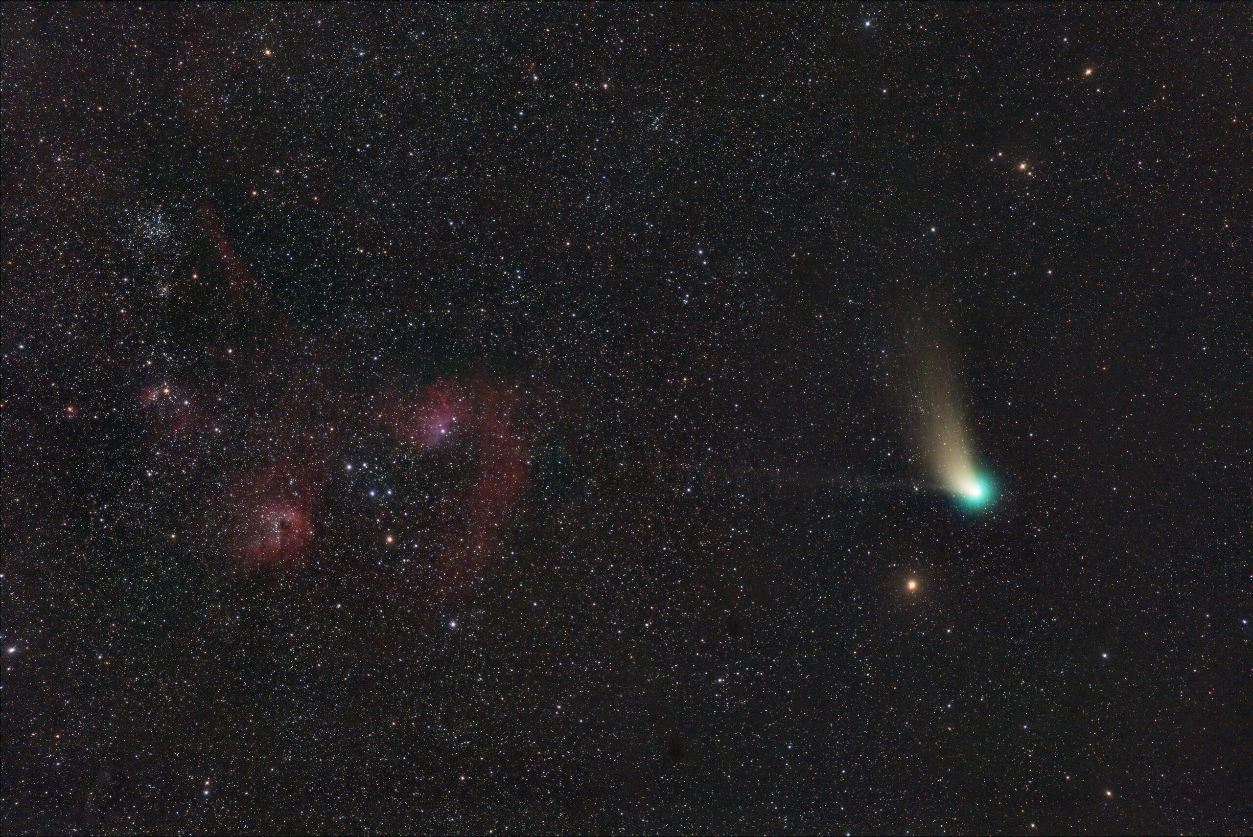 M38, IC405, IC 410 & C2022 E3 (ZTF), Canon EOS6Da EF200 ISO1600 23 x 100s iEQ30Pro, Gahberg 20230208 UTC 18: Mitte links ist ein heller Stern umgeben von blauem Reflexionsanteilen in einem roten Nebel zu sehen. Es handelt sich um IC 405 der Flammensternnebel genannt wird. Er ist ca 1500 Lichtjahre entfernt, die enorme Leichtkraft des Stern ist die Quelle für die blauen Nebelanteile. In der linken Bildhälfte sind weitere rot leuchtende Wasserstoffnebel und der offene Sternhaufen Messier Nr. 38 zu finden. Aufgenommen am 08. 02. 2023 auf der Sternwarte Gahberg mit einem Canon EF200 2.8 Festbrennweite in einer Belichtungszeit von 23 x 100 Sekunden bei ISO 1600. Als Kamera kam eine umgebaute Canon EOS 6D zum Einsatz, es wurden Filter entfernt und die Rotanteile außerhalb unseres Sehsprektrum aufnehmen zu können. Bearbeitet mit der Software Pixinsight und Photoshop.