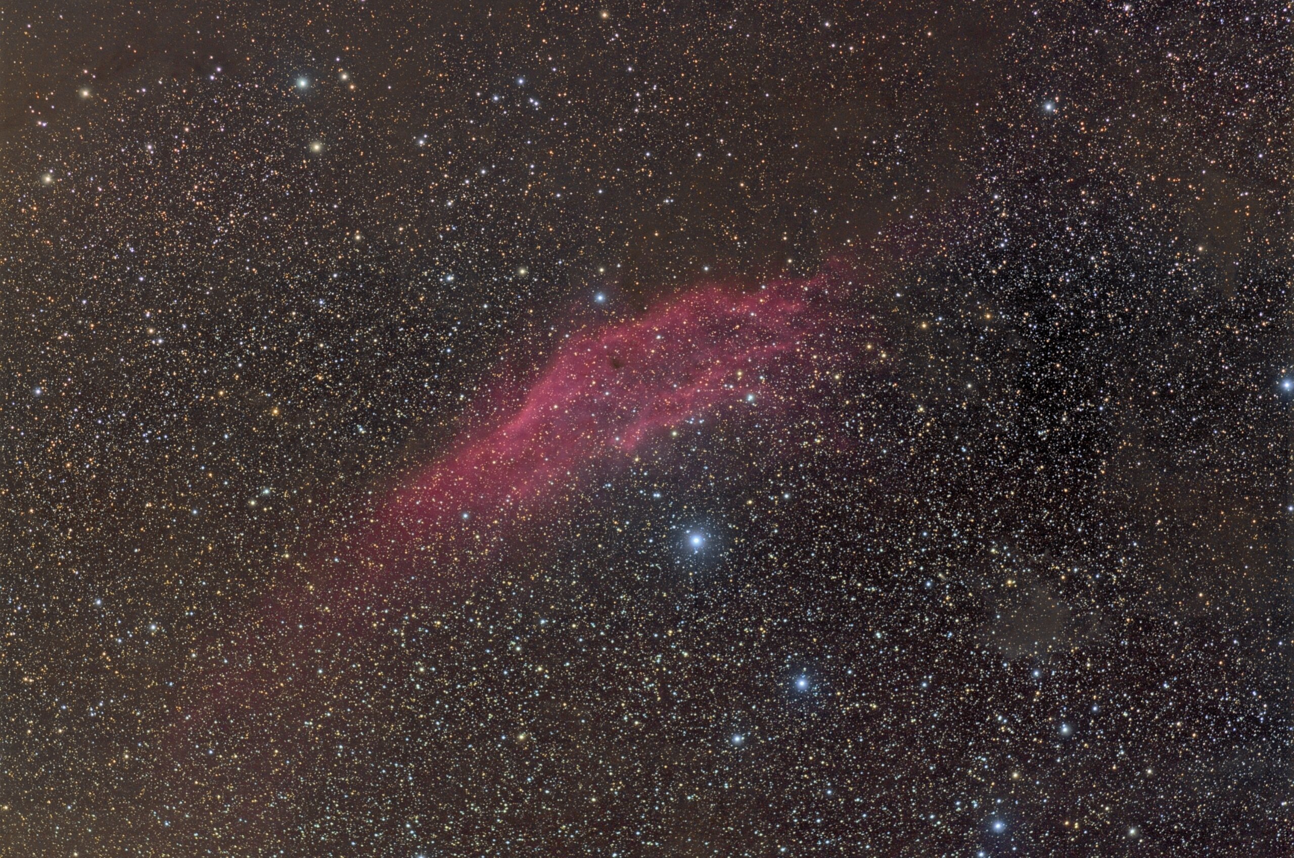 Ngc 1499, der Californianebel im Perseus mit 160 Bogenminuten scheinbarer Größe wurde mit einer nicht modifizierten Canon EOS1100D und dem bewährten Canon EF200 f3,5 Eos 1100D 109 x 5 min belichtet. Das Objektiv war mit einem Getriebeneiger auf das Objekt im Perseus ausgerichtet während das Hauptinstrument auf der Gemini G42 VDB 15 im Sternbild Giraffe belichtete. Gahberg 20161129 - 1203