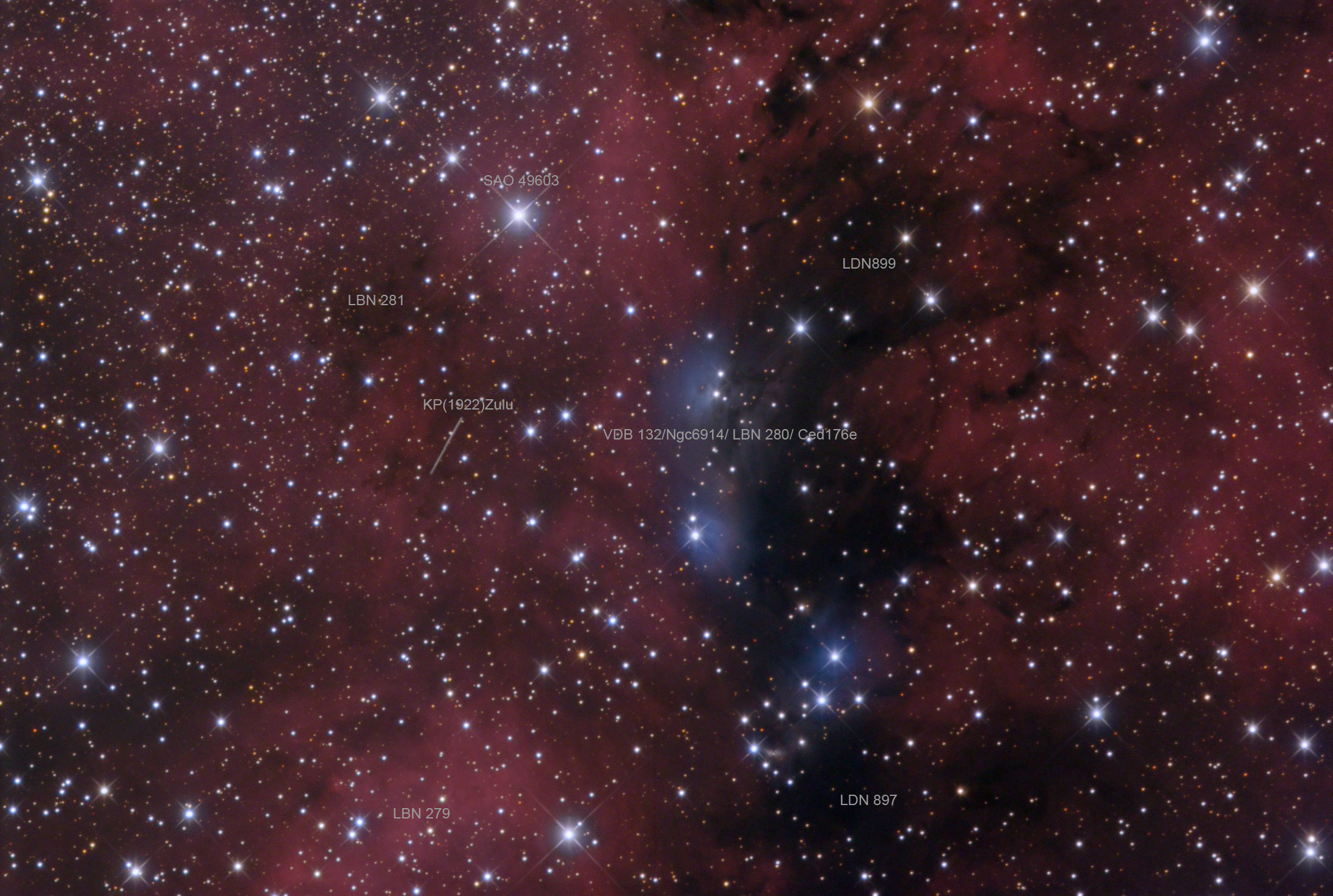 VDB 132, NGC6914 & KP(1922)Zulu in Cygnus Intes Mk69 St10XME L230min & TV NP101 SXV-H9 RGB 73/73/73 5min Subs Gahberg 20080704
